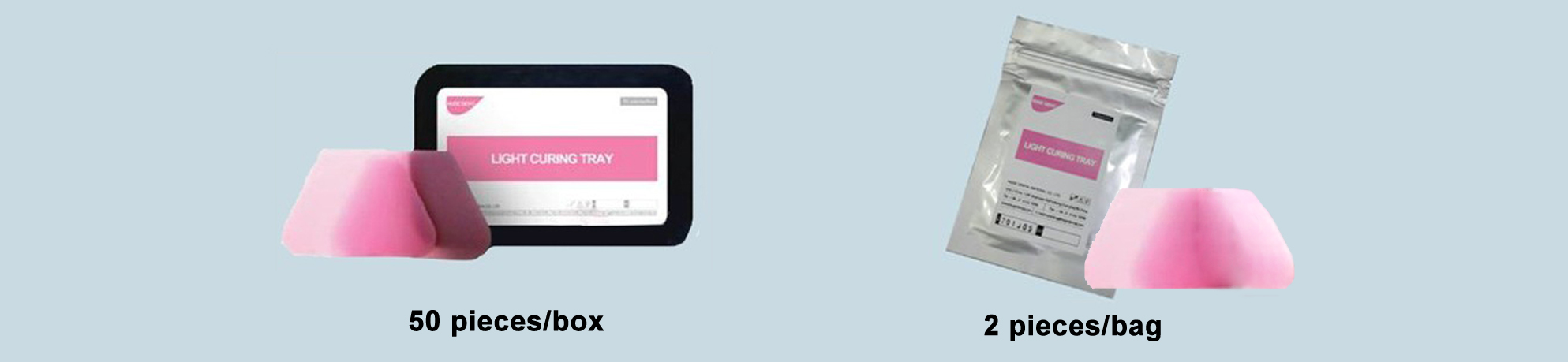– HUGE light curing material is ready for use and easy to be handled. It can be used within sufficient time to mold. LC tray can be cured in all typical polymerization devices: UVA/VIS blended light/stroboscope (wavelength of 420-480 NM) or UV (wavelength of 350-400NM).