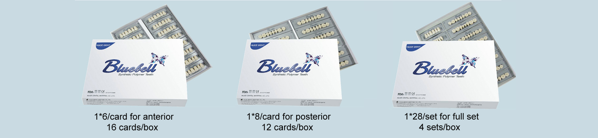 Designed according to the classic teeth shape in the world, Bluebell has the ability to suit all facial characteristics around the world. Adopted by the advanced heat and cool press molding and enamel layer wrap around technology, Bluebell becomes a very popular economical tooth in the world today.