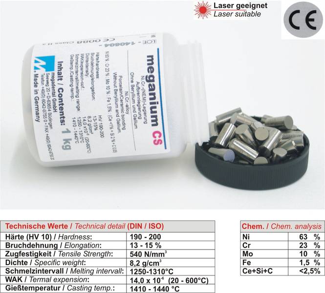 Meganium CS Ni.Cr.Mo.-alloy, without beryllium & gallium. Ceramic works – alloy. – DIN EN ISO 6871-2 Art. No. Unit 13-450 1000 g can